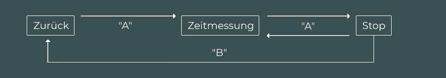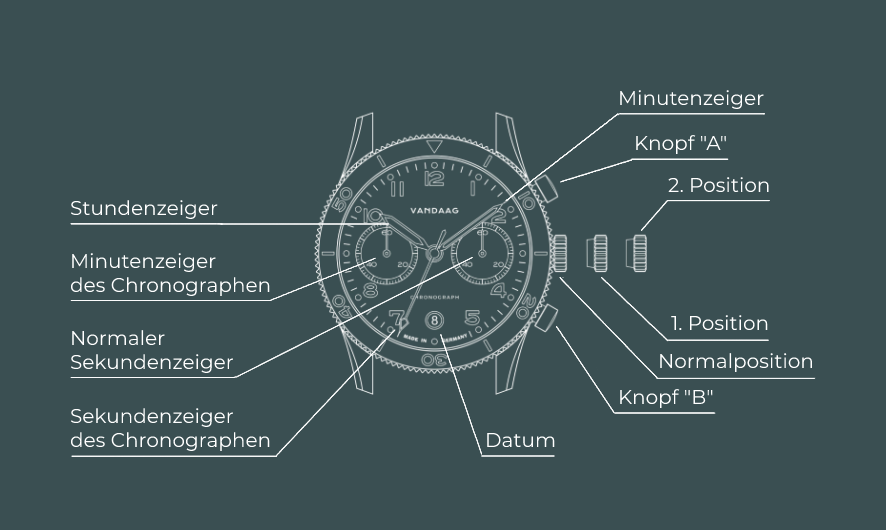 - Mit jedem Drücken von Knopf „A“ wird der Chronographen gestartet oder gestoppt.