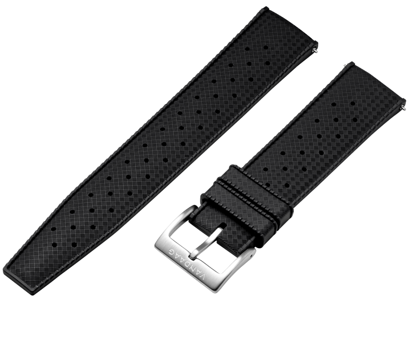 Das Kautschukband "Munter" besteht aus durablem FKM-Kautschuk im Tropical-Stil. Es ist durabel, UV-beständig und verpasst jeder Uhr noch einmal einen Extraschub Sportlichkeit.