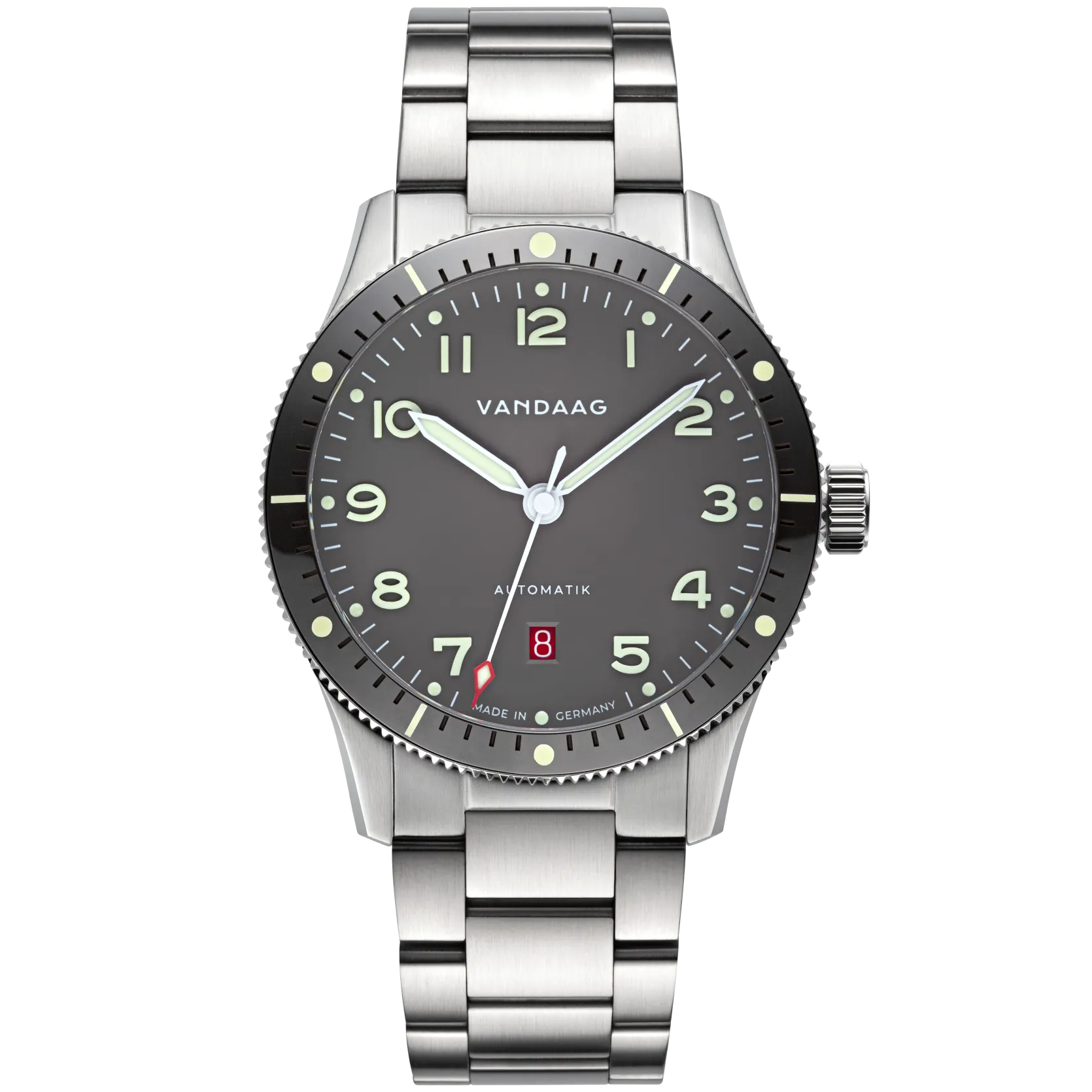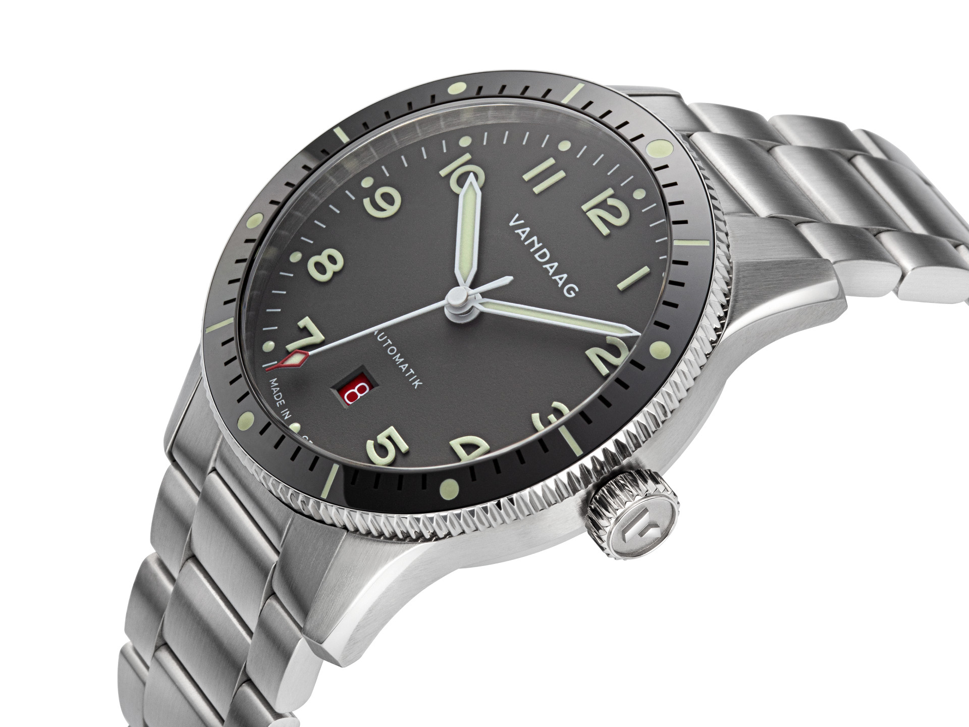Die aufgeräumte Optik ermöglicht die bestmögliche Kombination aus Design und Funktion. Das Zifferblatt mit deutlichen 11 arabischen Ziffern und matter, grauer Oberfläche wird komplettiert von unserem „Tupfer“ Extravaganz: Dem roten Datum.