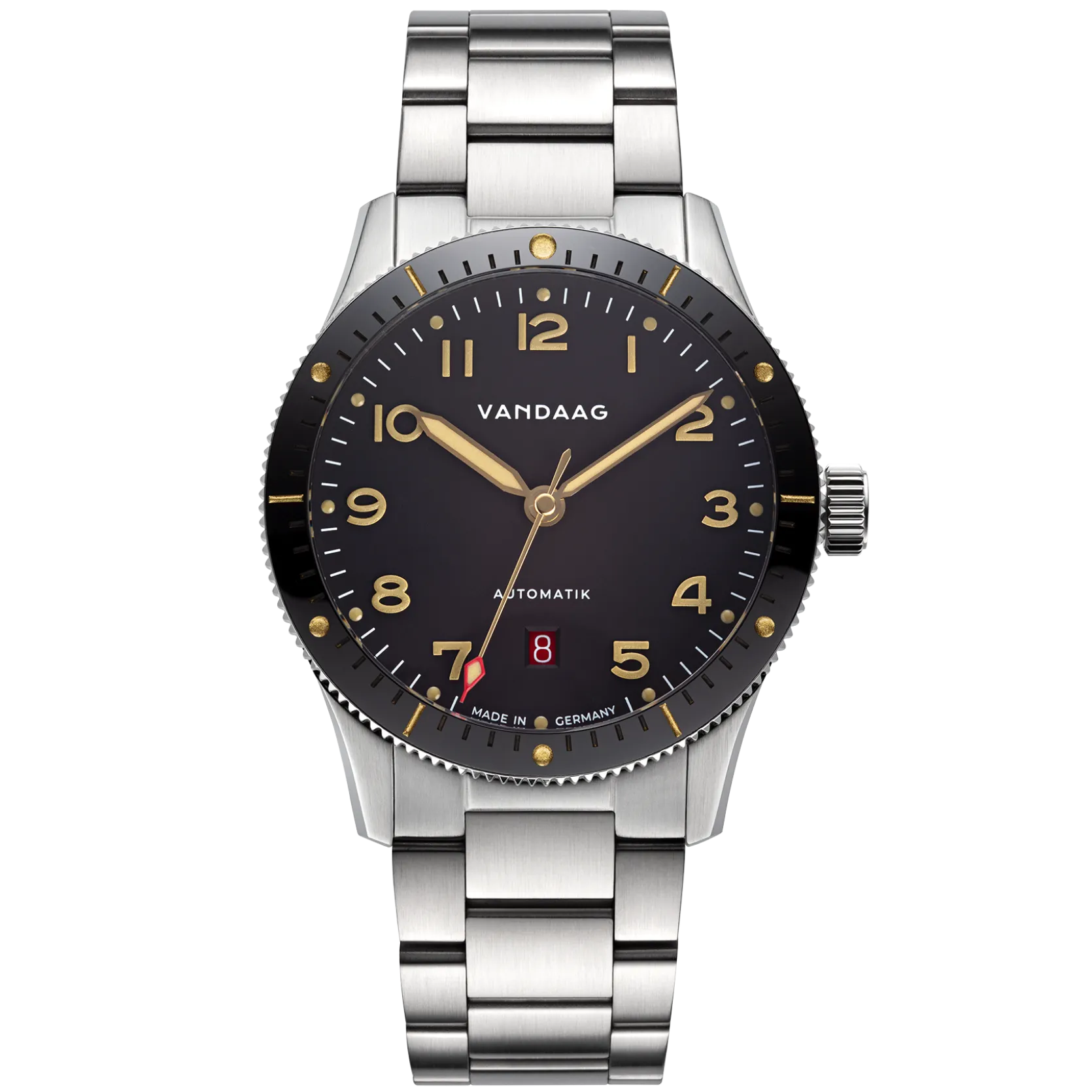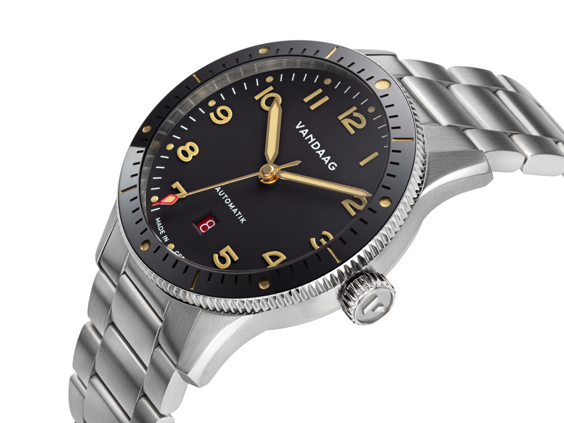 Die aufgeräumte Optik ermöglicht die bestmögliche Kombination aus Design und Funktion. Das Zifferblatt mit deutlichen 11 arabischen Ziffern und matter, schwarzer Oberfläche wird komplettiert von unserem „Tupfer“ Extravaganz: Dem roten Datum.