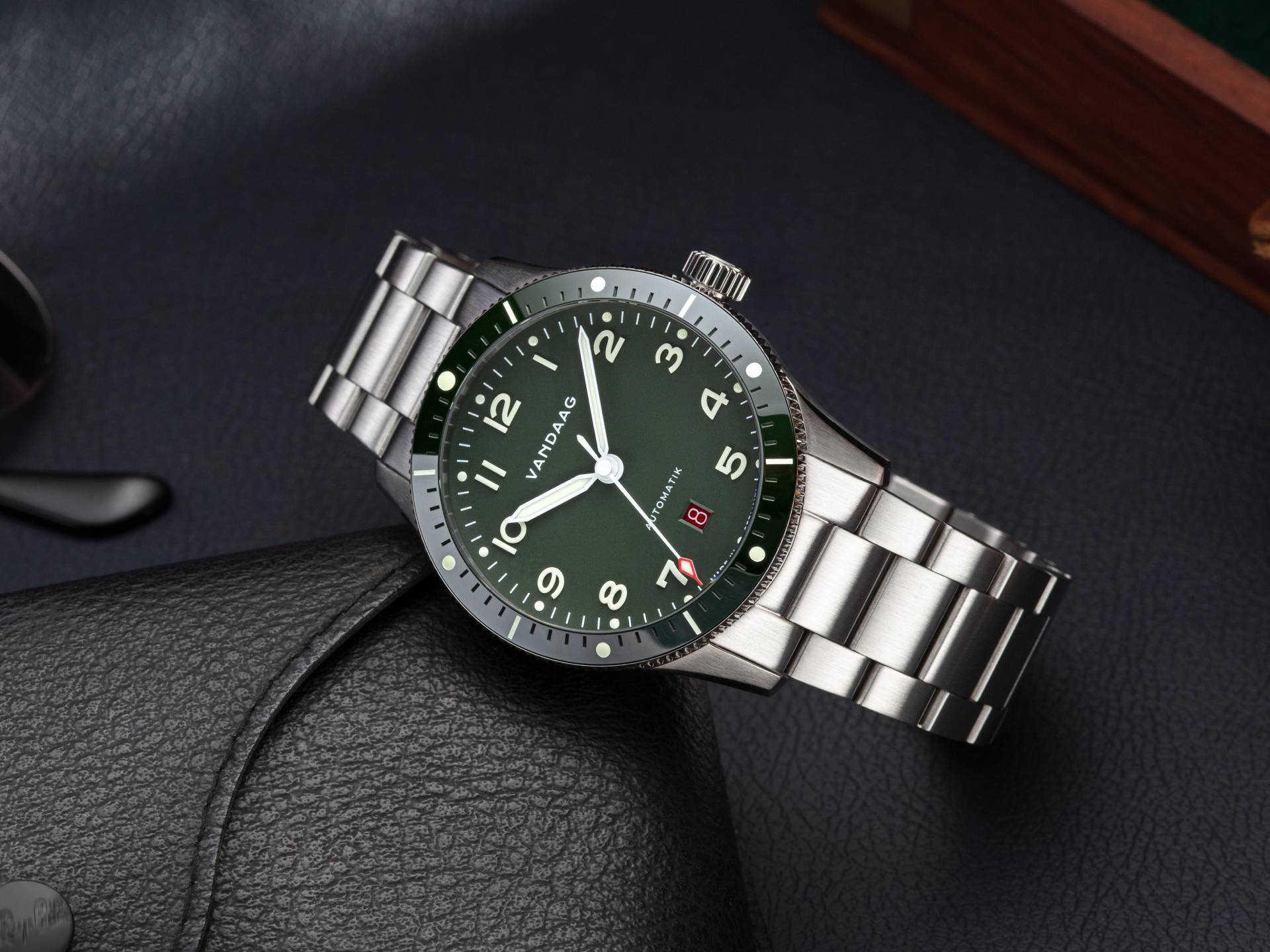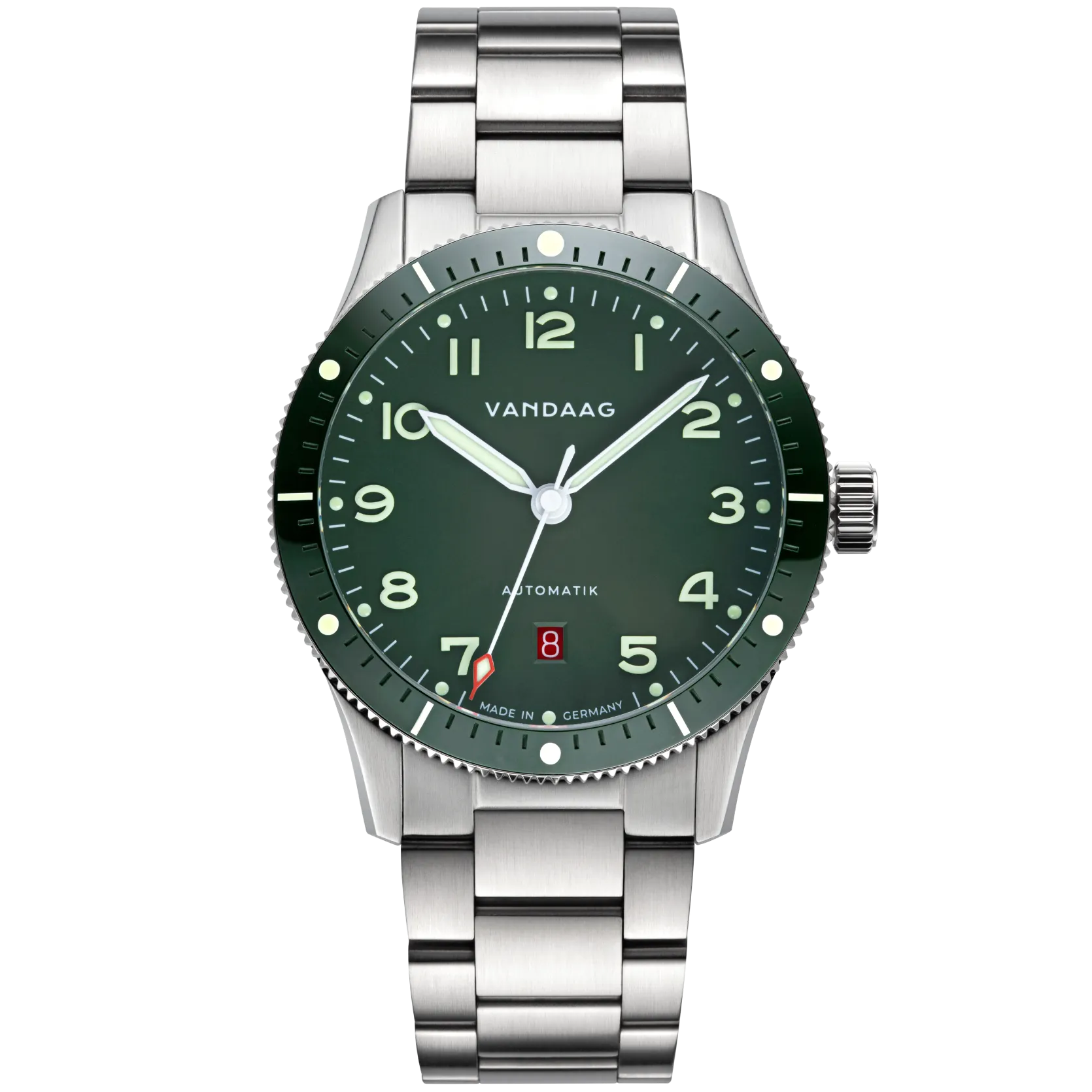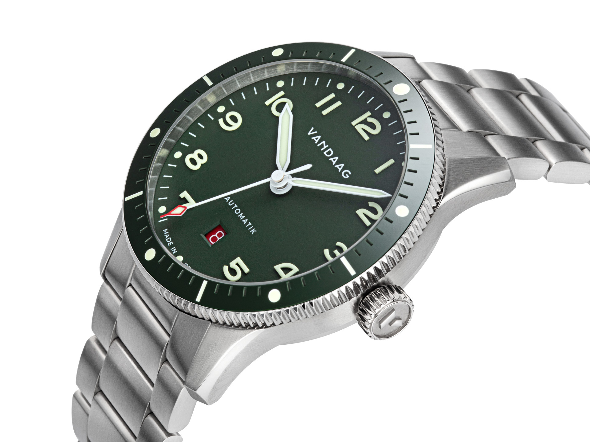 Die aufgeräumte Optik ermöglicht die bestmögliche Kombination aus Design und Funktion. Das Zifferblatt mit deutlichen 11 arabischen Ziffern und matter, grüner Oberfläche wird komplettiert von unserem „Tupfer“ Extravaganz: Dem roten Datum.