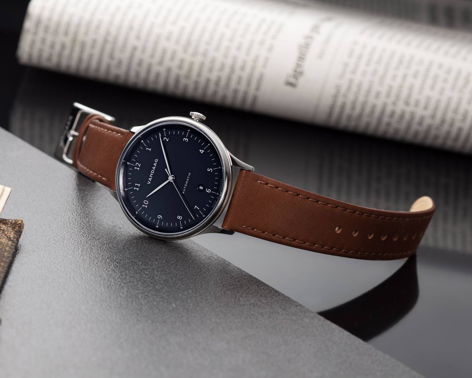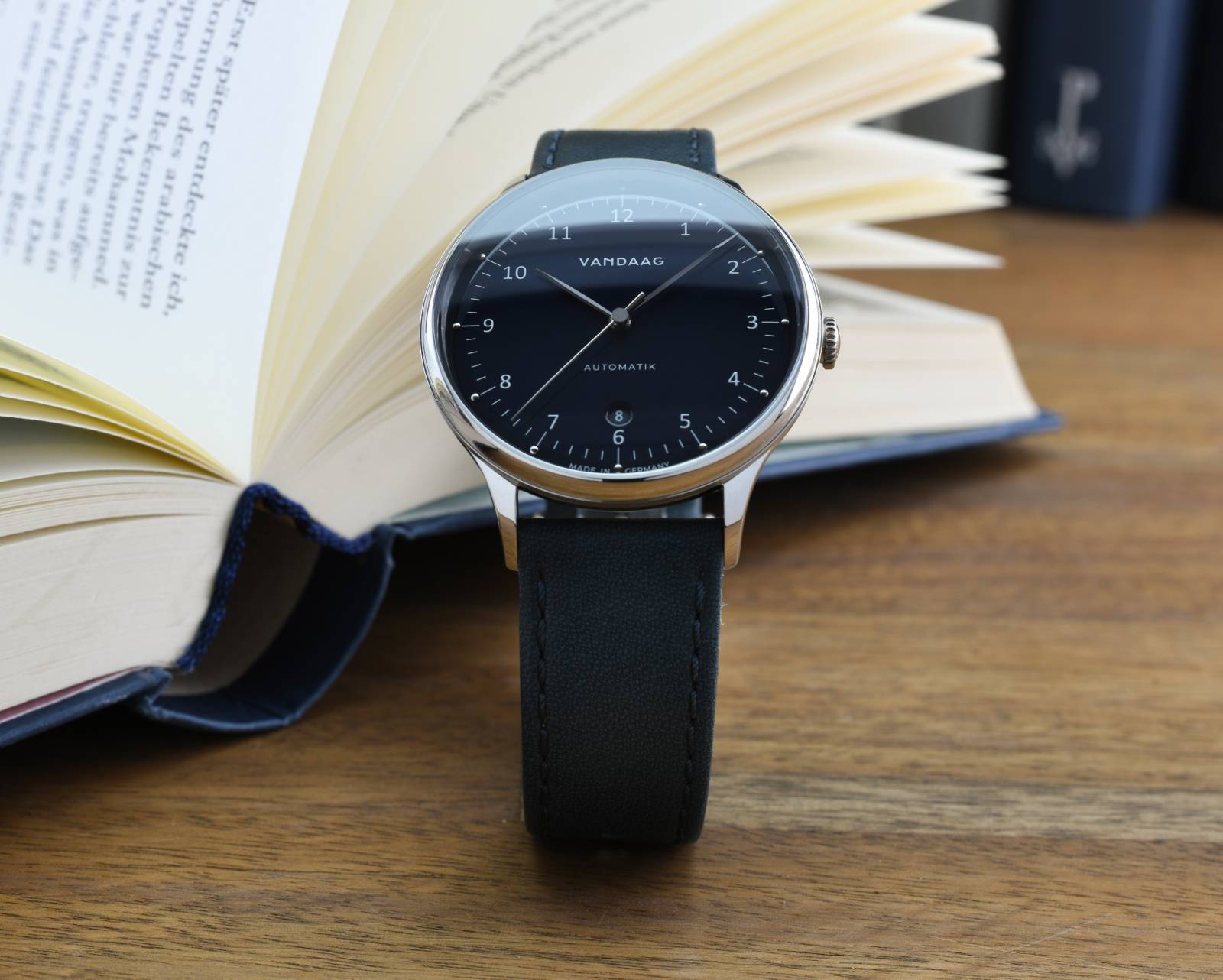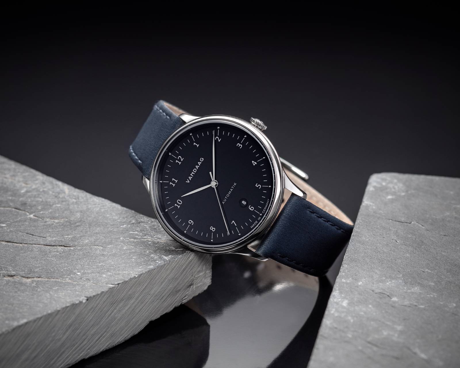 Mit ihrem Retro-Look, dem 40mm Edelstahlgehäuse, dem soften Lederband, dem fein gewölbten blauen Zifferblatt und den klaren arabischen Zahlen ist die Primus eine sehr elegant-klassisch anmutende Dresswatch.