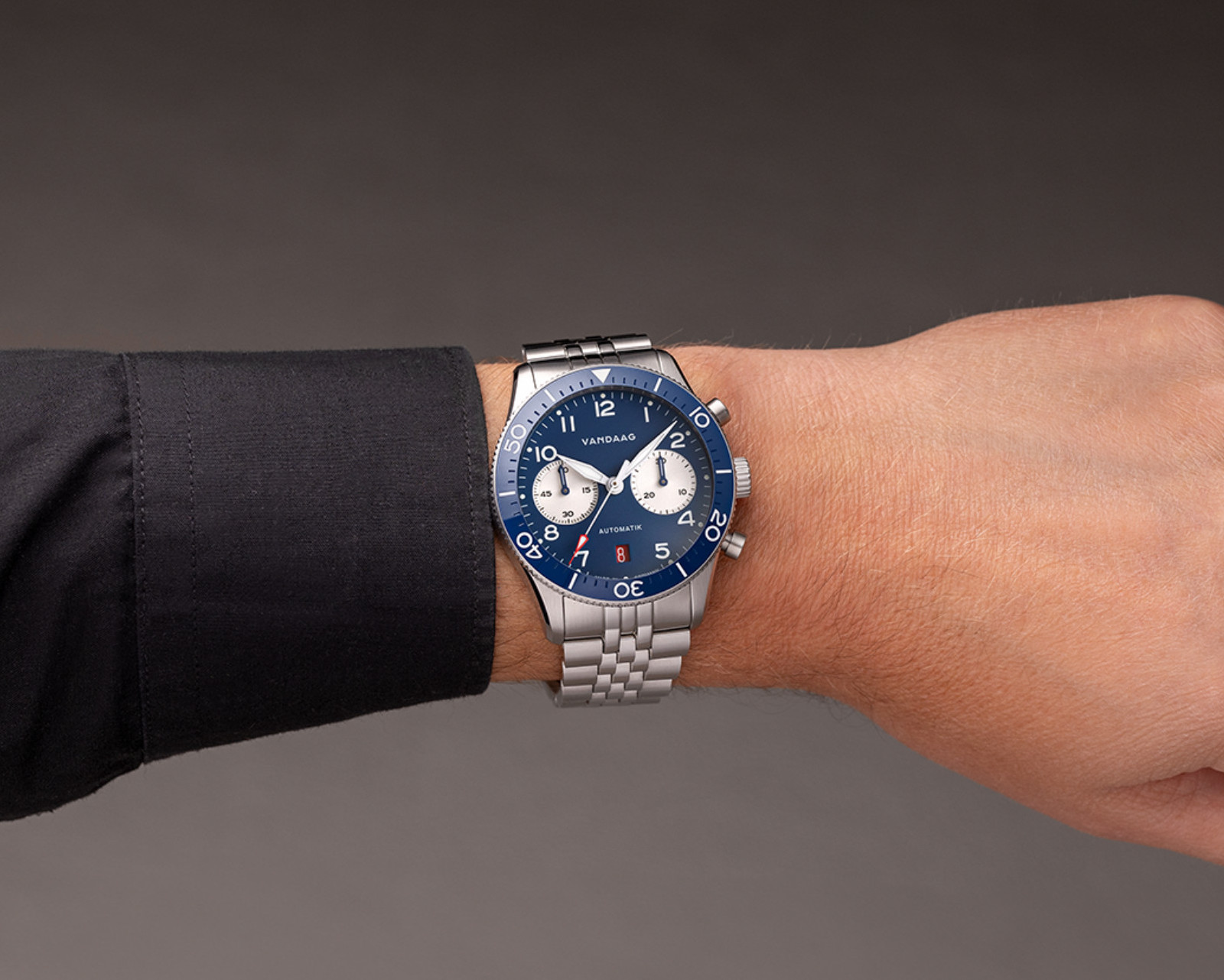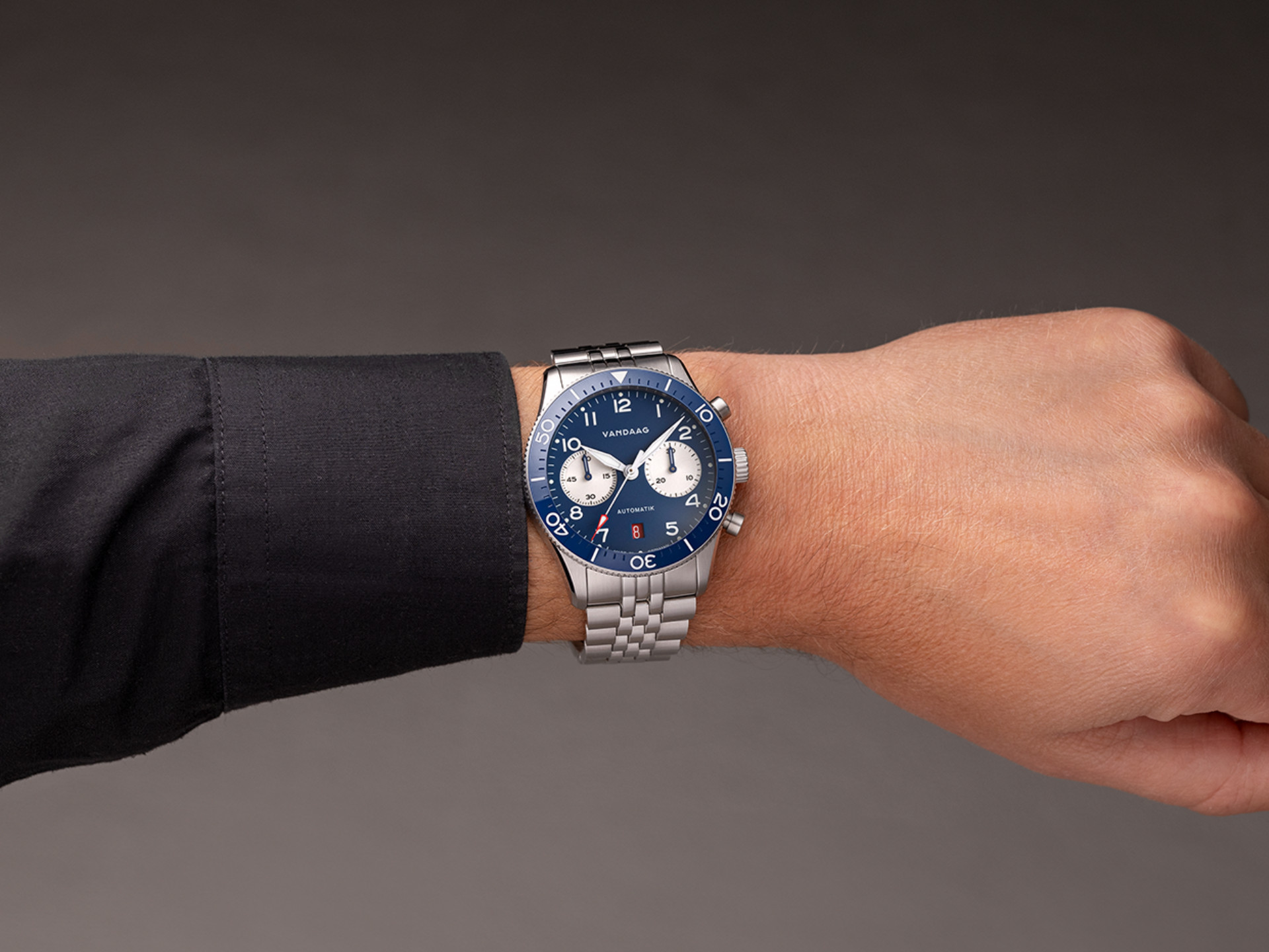 Neu in der Kollektion der Schallmauer Automatik ist das massive, 5-gliedrige Stahlband, welches der Uhr eine noch kernigere Präsenz verleiht. Die Kürzungsglieder sind verschraubt, die Uhr ist daher mit dem mitgelieferten Werkzeug schnell selbst einzupassen. Natürlich verfügt auch das Stahlband über Schnellwechselstege, damit man den Look auch mal schnell auf ein anderes Band verändern kann. Neu ist die verbesserte, massive Faltschließe, die über eine innenliegende Schnelljustierung verfügt. Ideal bei jeder Temperatur.