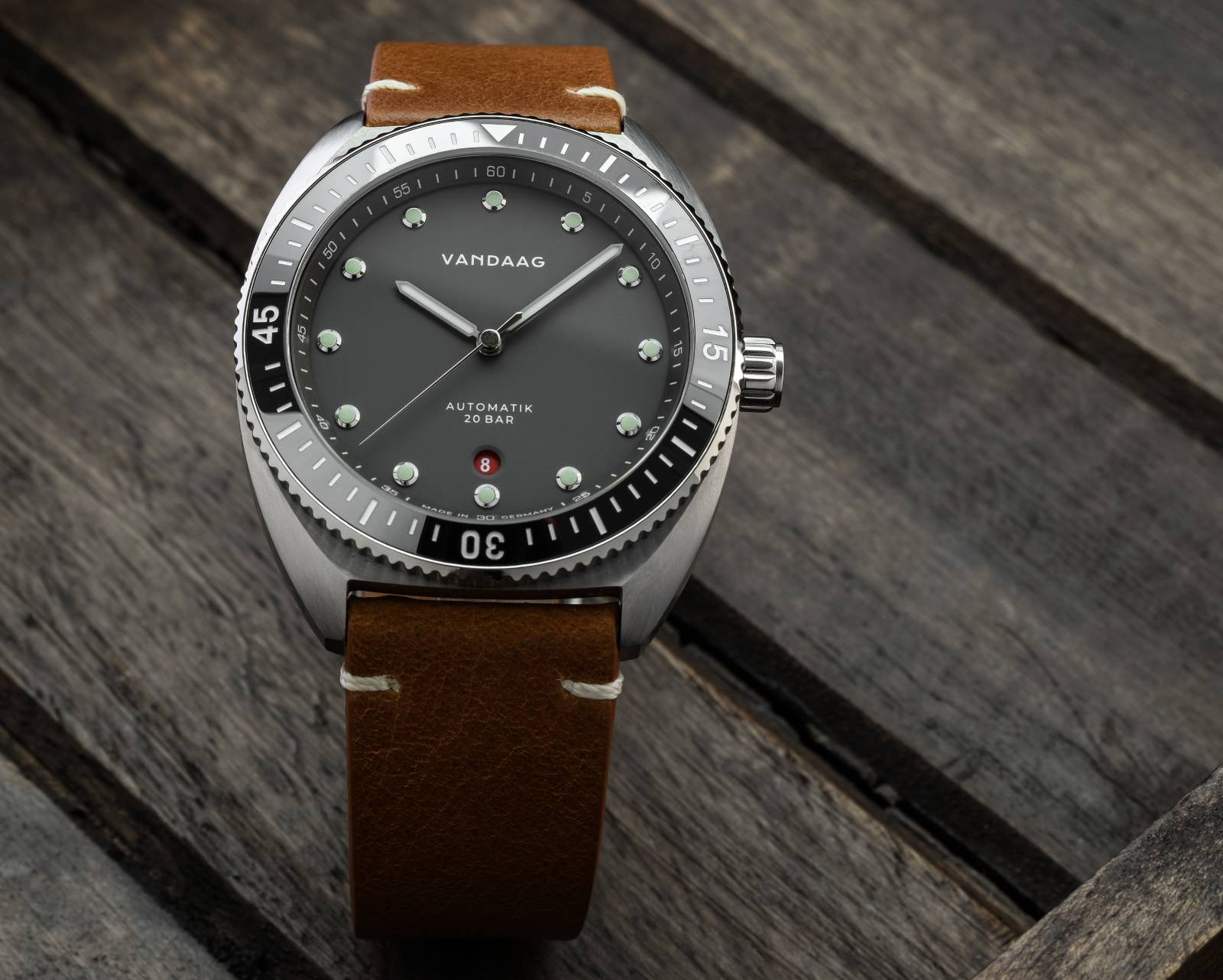 Das markante CNC bearbeitete 20BAR Retro-Gehäuse unterteilt die gebürsteten Oberflächen durch präzise gearbeitete Kanten. Die einseitig drehbare Taucherlünette mit 60-Minuten Graduierung ist in 120 Schritten fein gerastert wodurch sich Tauch- und Dekompressionszeiten präzise ablesen lassen. Die Keramikeinlage ist äußerst kratzfest und passt perfekt zum harten Saphirglas.