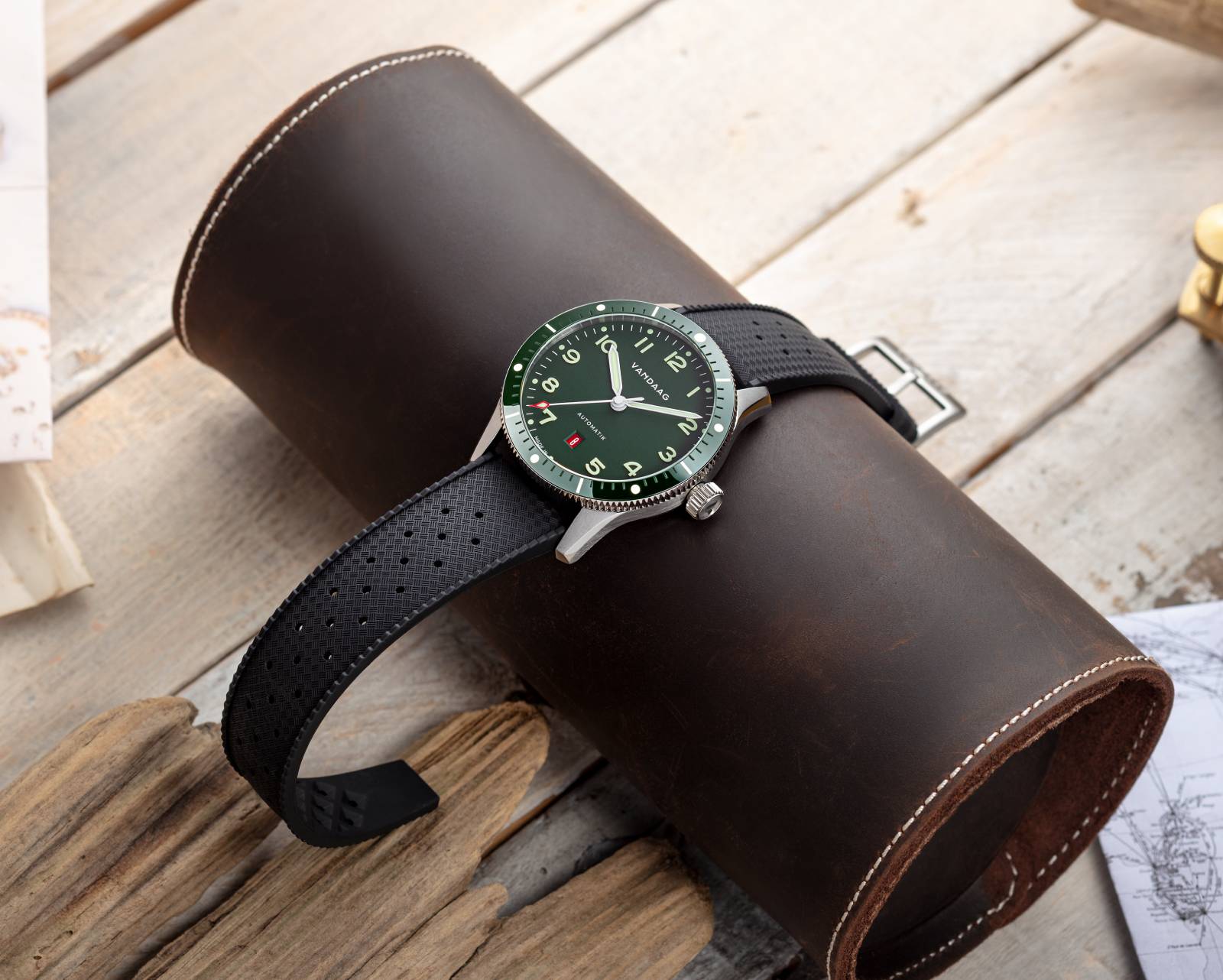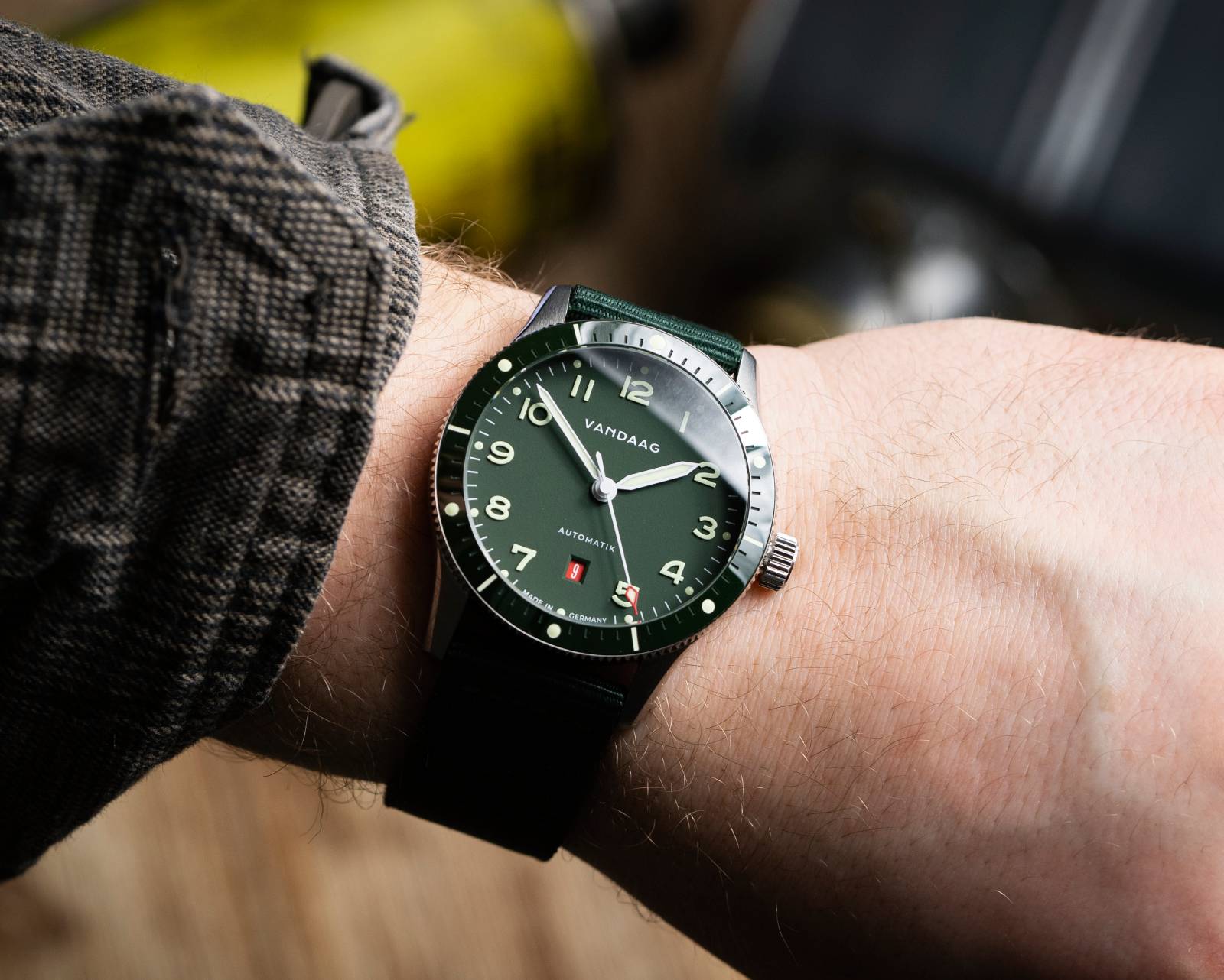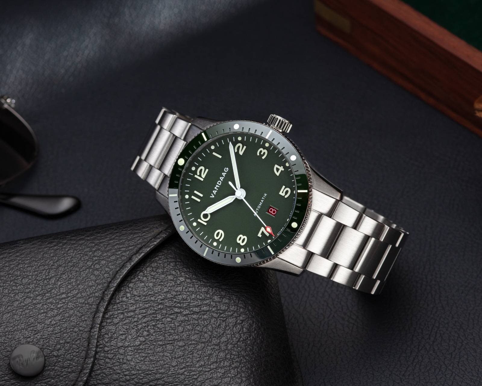 The tidy look enables the best possible combination of design and function. The dial with clear 11 Arabic numerals and a matte, green surface is completed by our “touch” of extravagance: the red date.