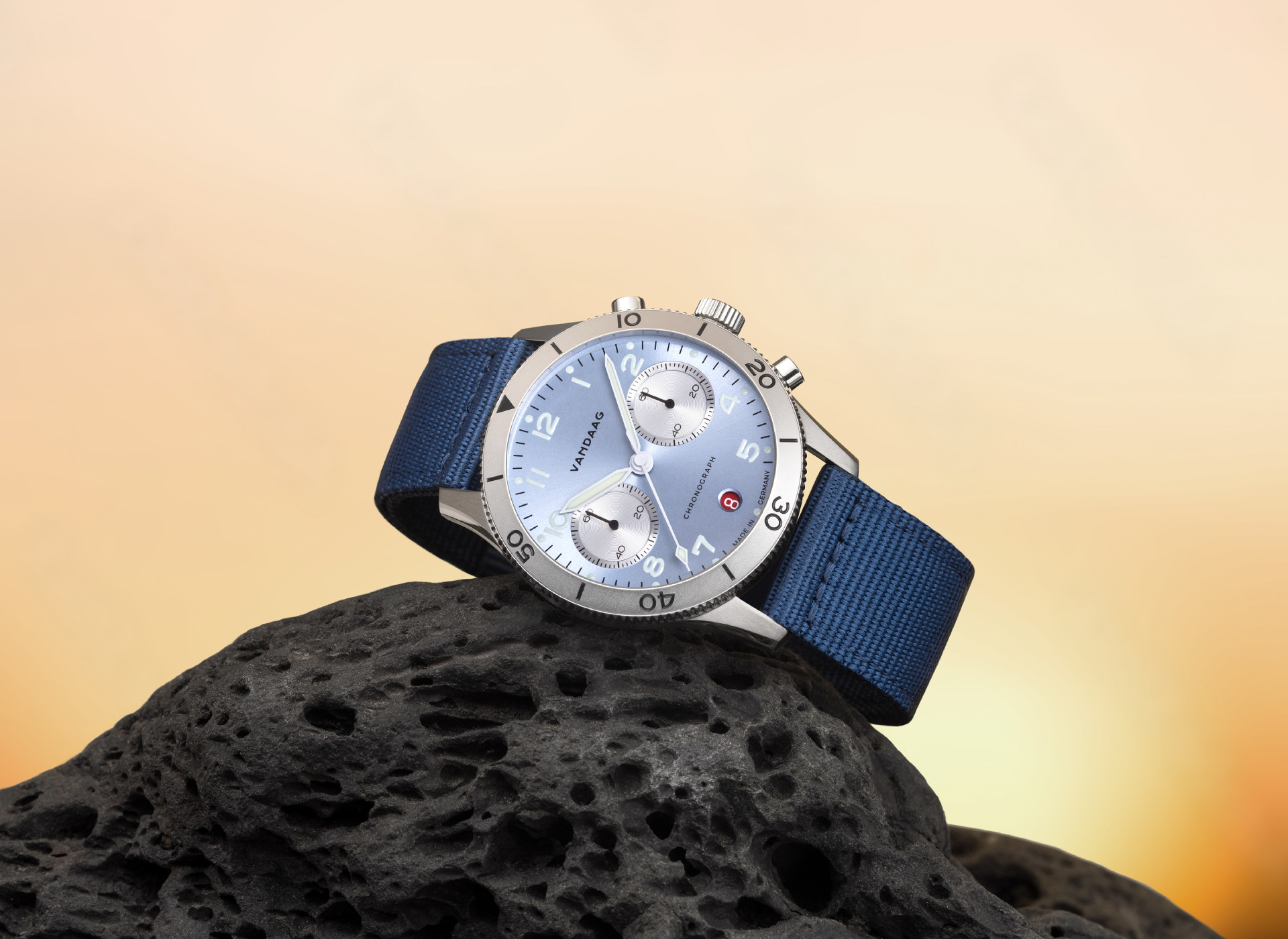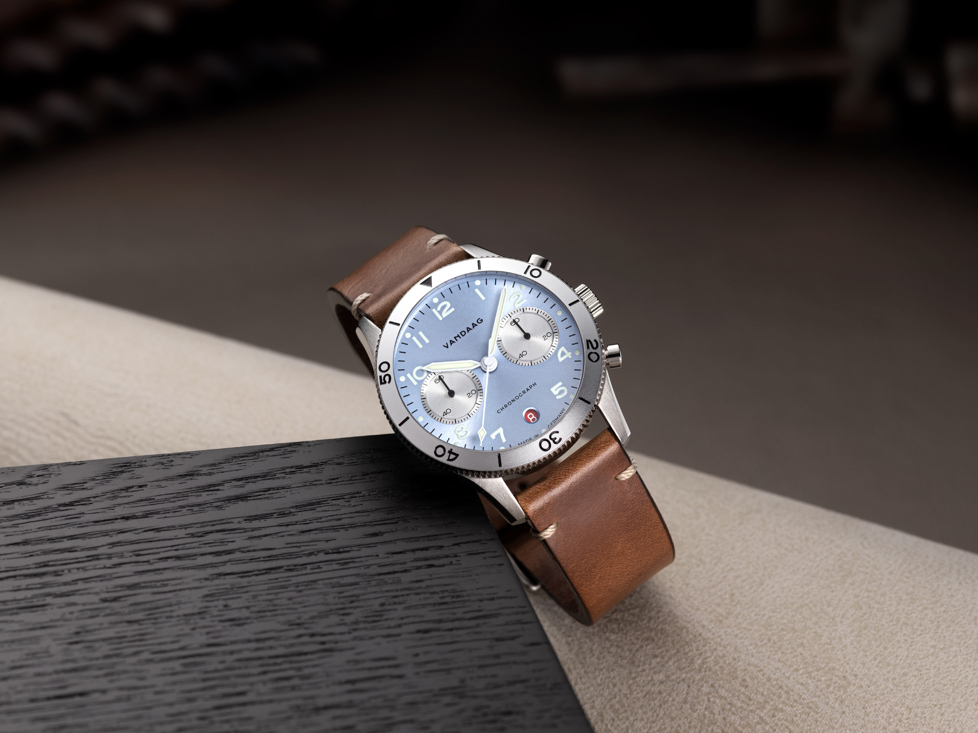 With its 42.5mm stainless steel case, the soft oiled leather strap and the ice blue chronograph dial, the Schallmauer seamlessly continues the exciting history of aviation tradition. And it also rewrites it.