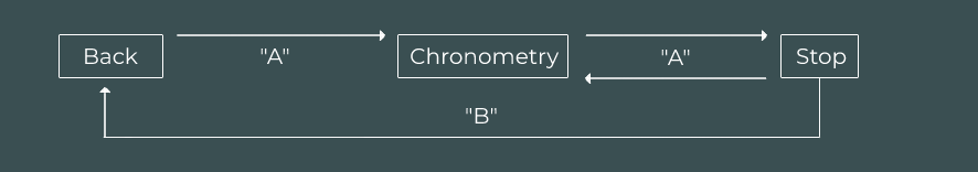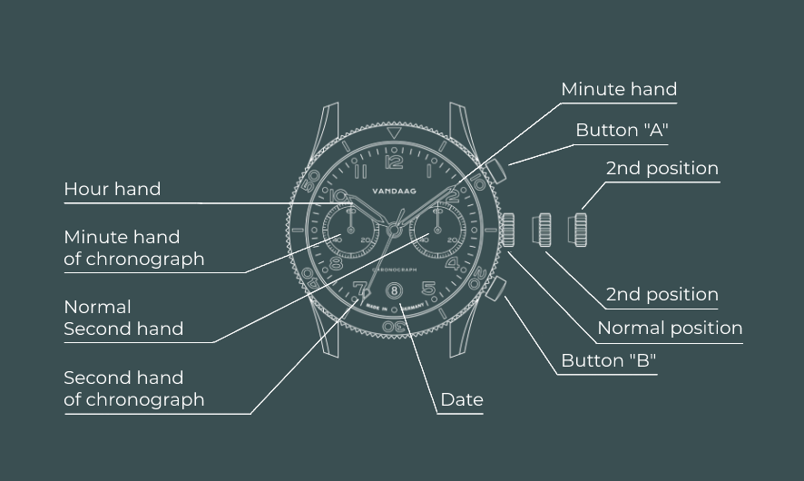2. Press button "A" once to set the chronograph second hand to the zero position. You can quickly advance the chronograph hands by keeping button "A" pressed.