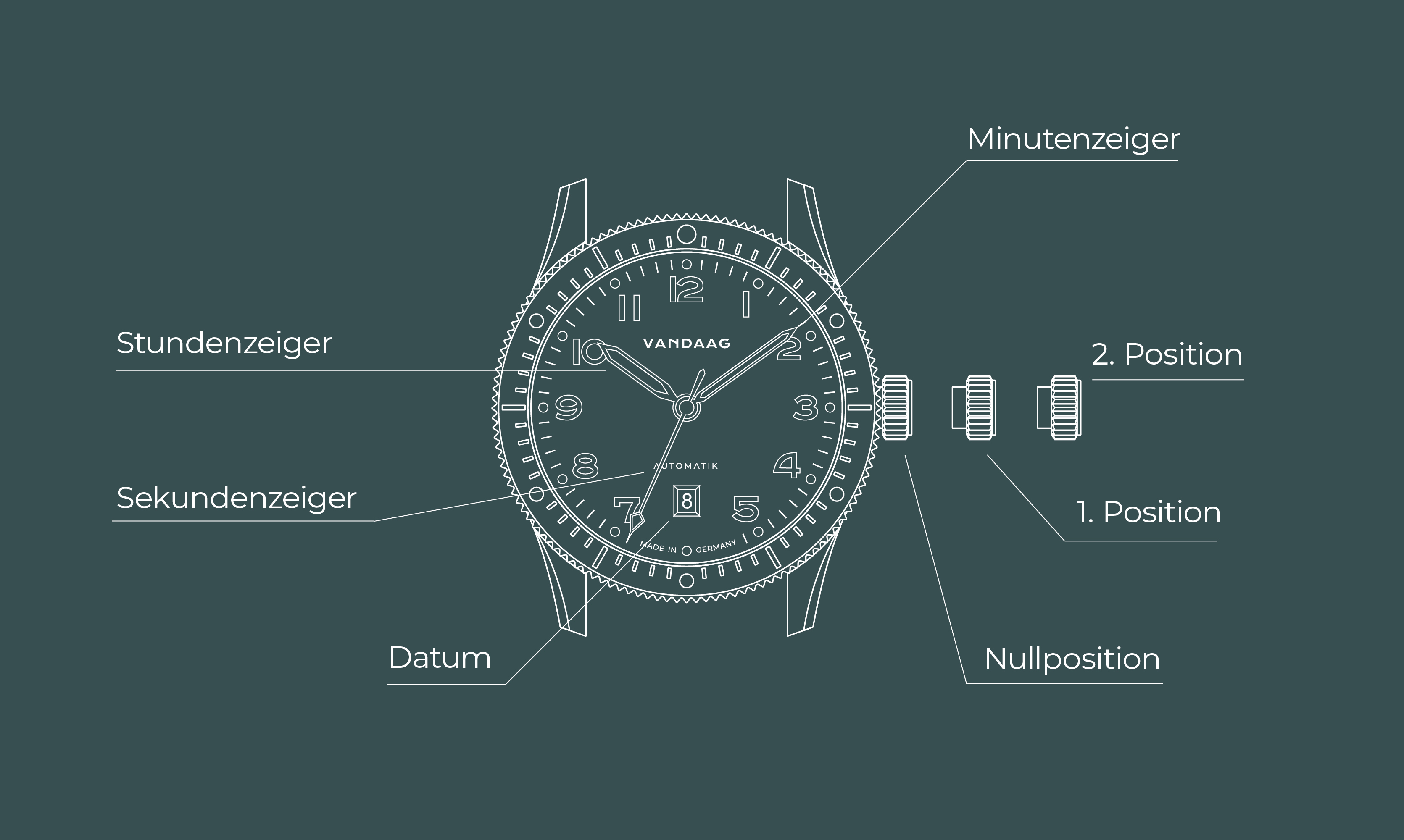 Um die Funktion des Automatikwerkes nicht zu gefährden raten wir davon ab das Datum im Zeitfenster von 21:00 bis 3:00 Uhr zu stellen.